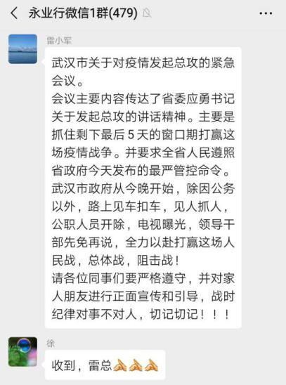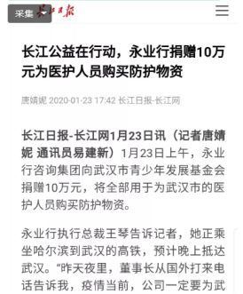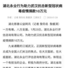 1月23日,臘月二十九日。凌晨兩點,一條前所未有的通告,讓潘世炳一夜未眠?!皬?3日10時起,暫時關閉室內公共交通以及航空和鐵路的離漢通道?!边@條信息讓潘世炳意識到,這場沒有硝煙的“戰(zhàn)爭”正在全面升級。天一亮,他便召集永業(yè)行高管召開視頻會議,親自擔任疫情防控工作領導小組組長,圍繞抗疫捐助、疫情防控、員工健康監(jiān)測、信息排摸、工資發(fā)放及困難員工救助等進行專題研究。23日下午4時,永業(yè)行捐贈的10萬元新冠肺炎疫情防控專款轉入武漢市青少年發(fā)展基金會賬戶,成為疫情發(fā)生后國內首家捐贈的專業(yè)服務機構,多家媒體宣傳報道。
