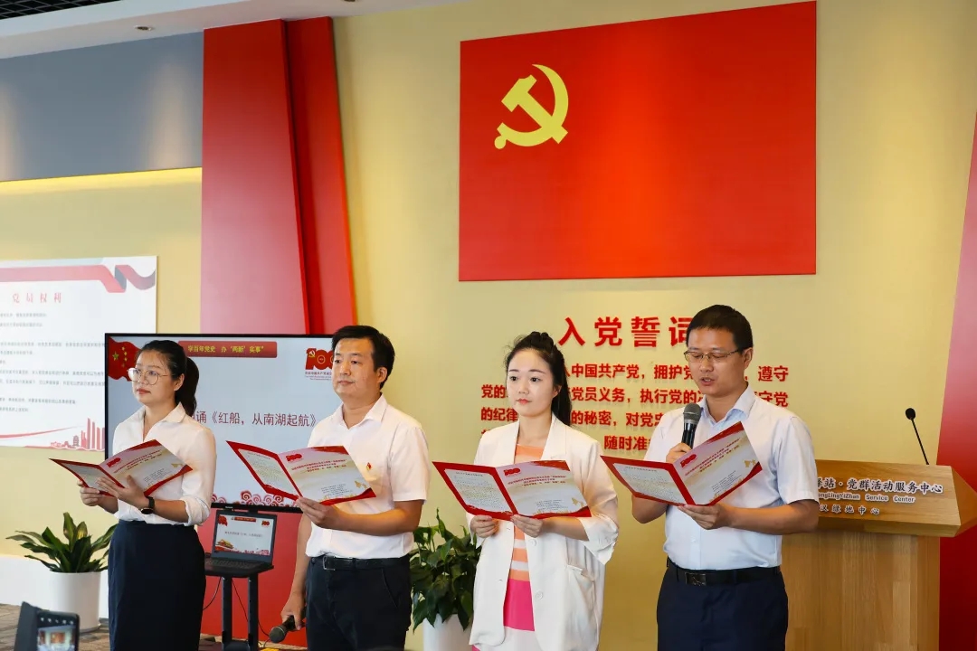 活動(dòng)中全體成員重溫入黨誓詞,認(rèn)真聆聽了由武漢中共中央機(jī)關(guān)舊址紀(jì)念館副館長、武漢市黨史宣講團(tuán)成員周靜講授特色黨課《辦好中國的事情關(guān)鍵在黨》,觀看了區(qū)委組織部、區(qū)委宣傳部指導(dǎo)拍攝的黨史教育宣傳片《珞珈紅脈——周恩來在珞珈山》,區(qū)商務(wù)局、徐家棚街、中鐵物貿(mào)、國能華中四名青年黨會(huì)員代表朗誦紅色詩歌《紅船,從南湖起航》,全體黨員合唱《沒有共產(chǎn)黨就沒有新中國》,集體接受黨史學(xué)習(xí)教育。