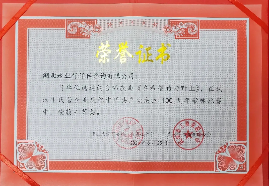 百年風雨滄桑,百年壯麗輝煌,我們迎來了中國共產(chǎn)黨的百年華誕。6月25日下午,由武漢市委統(tǒng)戰(zhàn)部、市工商業(yè)聯(lián)合會舉辦的“武漢市民營企業(yè)慶祝中國共產(chǎn)黨成立100周年歌唱比賽”在市青少年宮音樂廳隆重舉行。在武昌區(qū)工商聯(lián)會員企業(yè)黨委的推薦下,永業(yè)行合唱團與來自全市各區(qū)工商聯(lián)、工商聯(lián)所屬商會、會員企業(yè)的15支隊伍縱情高歌,唱響紅色經(jīng)典。永業(yè)行合唱團以飽滿的情緒深情獻唱的經(jīng)典歌曲《在希望的田野上》,以新穎的演唱形式、豐富的表演內(nèi)容得到了專家評委和現(xiàn)場觀眾的認可,榮獲比賽三等獎。
