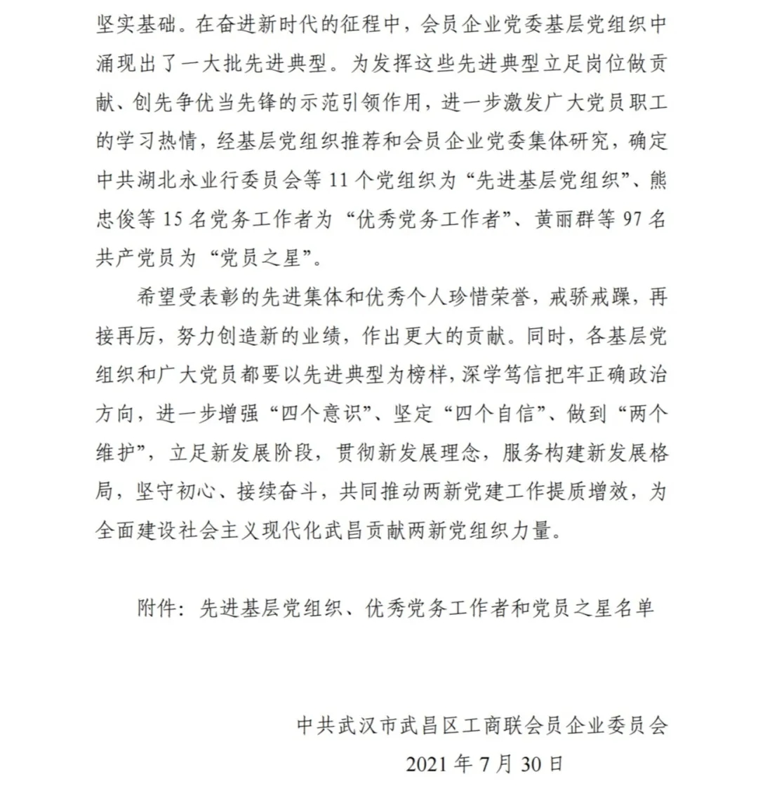 在慶祝黨的百年華誕之際,7月30日,中共武漢市武昌區(qū)工商聯(lián)會(huì)員企業(yè)委員會(huì)發(fā)文(武昌聯(lián)企黨字〔2021〕14 號(hào)),對(duì)會(huì)員企業(yè)先進(jìn)基層黨組織、優(yōu)秀黨務(wù)工作者和黨員之星進(jìn)行表彰,永業(yè)行黨委獲評(píng)“先進(jìn)基層黨組織”,周小川等20名黨員獲評(píng)“黨員之星”。
