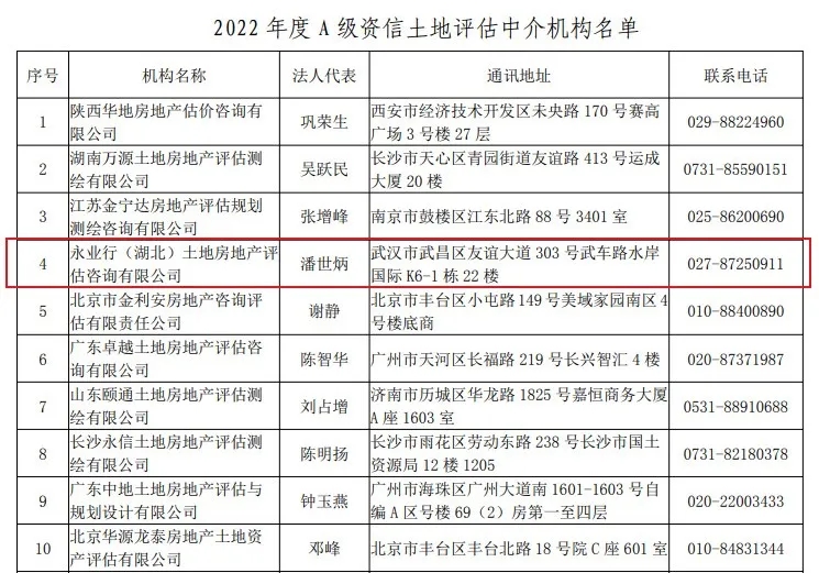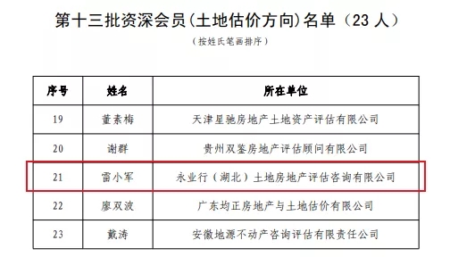 2021年12月23日, 中國土地估價師與土地登記代理人協會(下稱“中估協”)發布“2022年度A級資信土地評估中介機構”名單,在全國120家A級資信機構中,永業行位列全國第四、湖北第一,連續14年獲評“A級資信土地評估機構”。中估協同時公布了第十三批資深會員名單,副總裁雷小軍榮獲土地估價方向資深會員榮譽。