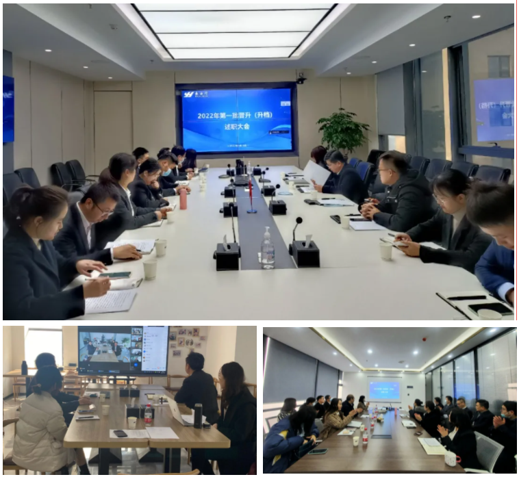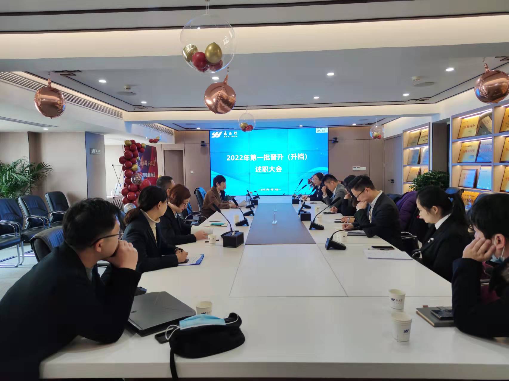 2022年1月18日,永業行召開2022年第一批擬晉升人員述職會議。輪值總裁王琴,副總裁雷小軍、吳學鋒、程為民,總部職能部門和各業務部門管理人員代表、優秀員工代表及全體擬晉升檔級人員共計80余人在四個會場參加了會議。