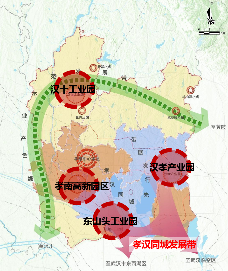 《方案》以“綜合開發,高效利用”為目的,通過對存量空間的“填充式開發”,推動“產-城-人”協調發展。以區域協同、品質提升和產業發展為切入點,提出區域融合發展型、城鎮品質提升型、產業升級發展型三條功能主線。在此基礎上形成“2+3+6”的十一個成片開發片區有效地保障了孝南區建設項目落地,為孝南“南城突起、兩帶支撐、孝漢融合、多點發力”的發展戰略實施提供了有力的支撐。