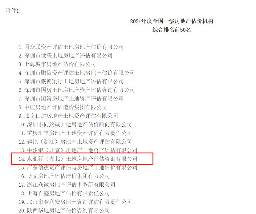 2022年3月30日,中國房地產估價師與房地產經紀人學會發布了《關于發布2021年度全國一級房地產估價機構排名結果的公告》(中房學〔2022〕9號),公告顯示永業行在全國952家一級房地產估價機構中名列前茅!