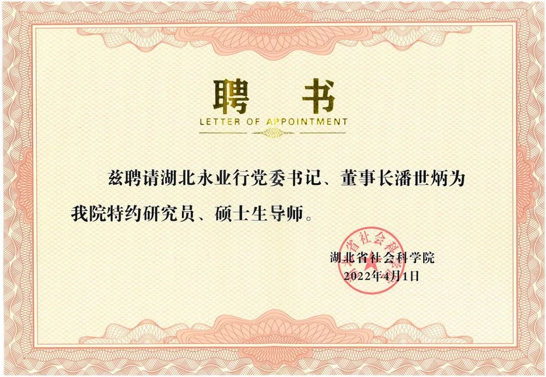 2022年4月1日,湖北省社會科學(xué)院舉行聘任儀式,永業(yè)行黨委書記、董事長潘世炳博士受聘為湖北省社會科學(xué)院特約研究員、碩士生導(dǎo)師。湖北省社會科學(xué)院黨組書記張忠家向潘世炳博士頒發(fā)聘書,黨組副書記、院長劉光遠主持聘任儀式。