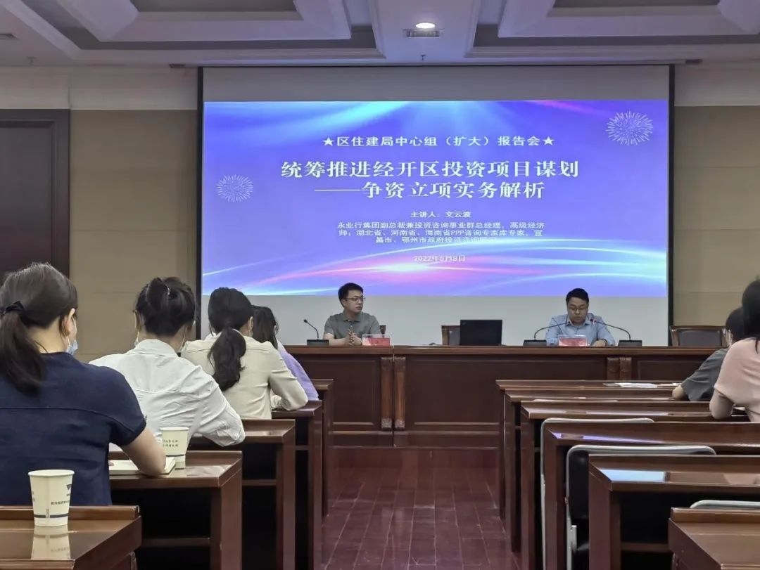 2022年5月8日,永業行咨詢評估集團副總裁文云波應邀為武漢經開區(漢南區)住房和城鄉建設局作“統籌推進經開區投資項目謀劃——爭資立項實務解析”專題交流培訓。武漢經開區(漢南區)住房和城鄉建設局黨組書記、局長樊友川主持會議。