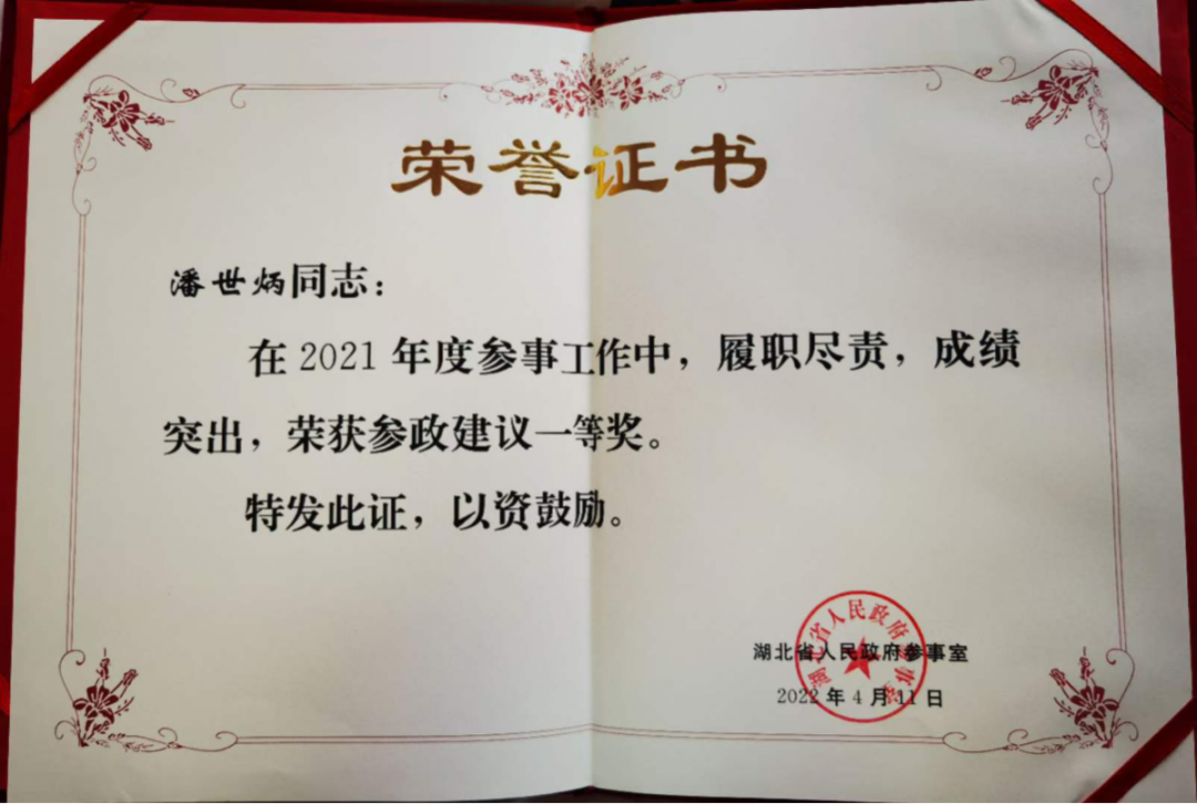 湖北省政府參事、永業行董事長潘世炳榮獲參政建議一等獎