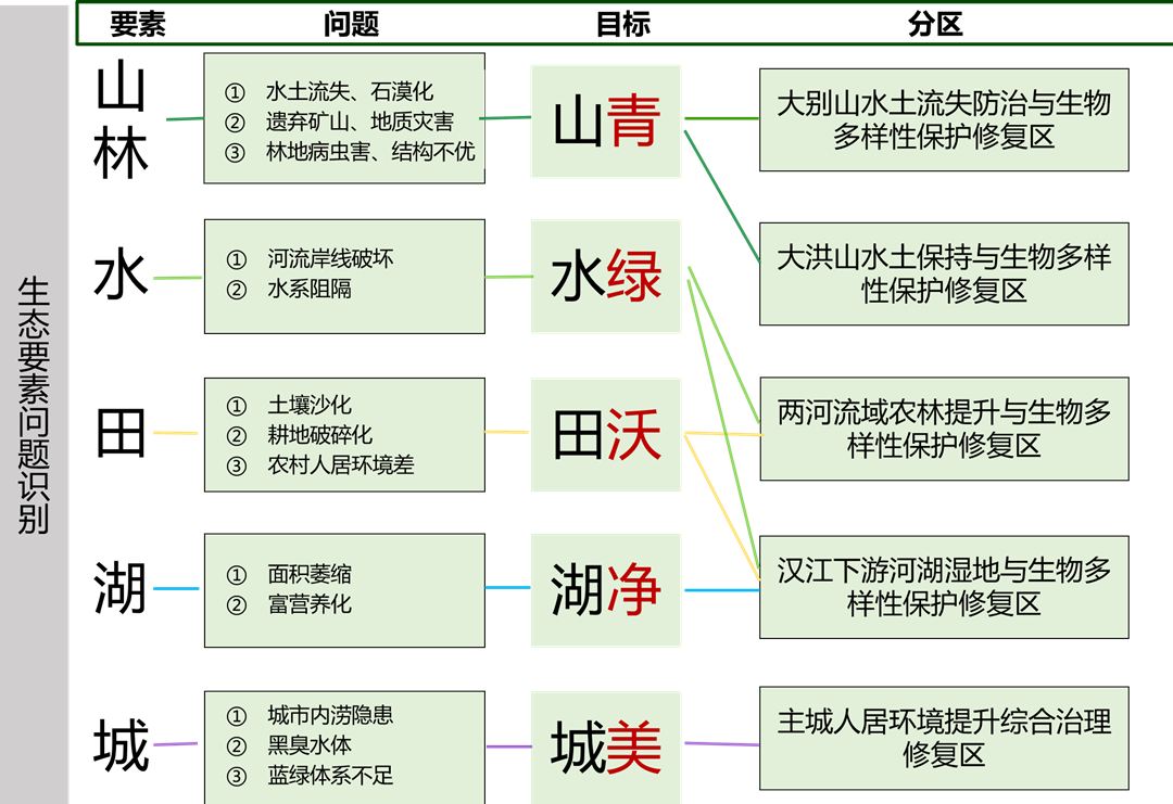 在上位規劃確定的生態保護格局基礎上,根據孝感市“雙評價”結果,結合國家及區域重大戰略,統籌考慮山水林田湖草沙生態系統特征及問題,劃分生態保護修復分區。