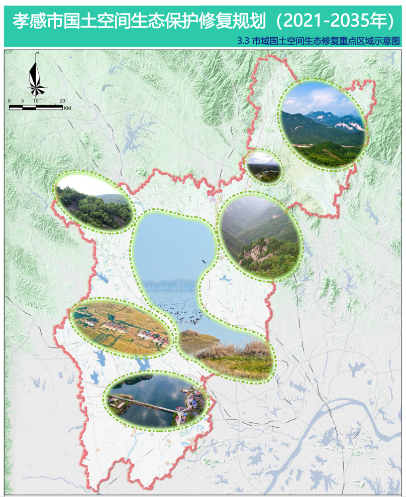 圍繞打造“山青、水綠、田沃、湖凈、城美”的魅力孝都的總體目標,構建“兩屏四廊一園多點”的生態保護修復總體格局。