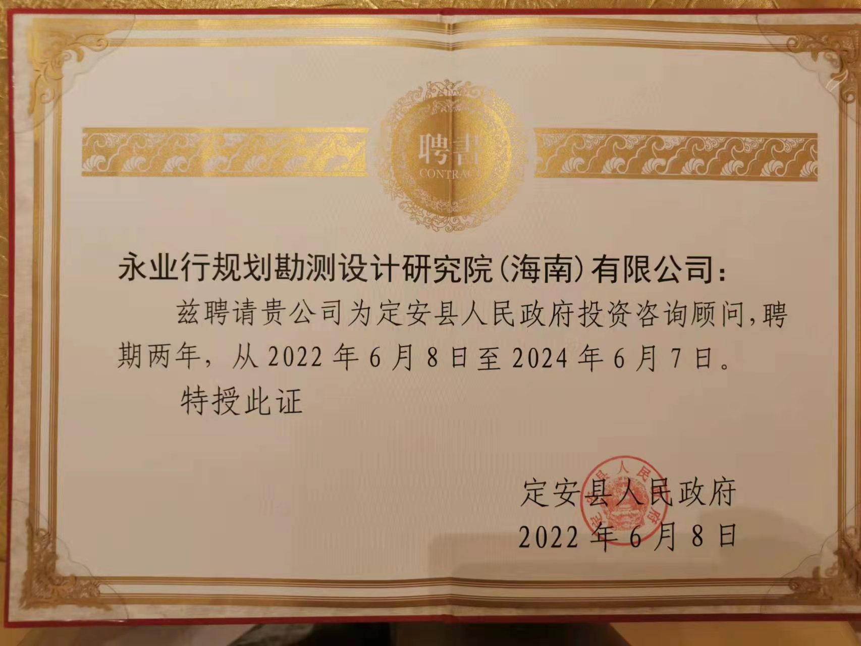 本次會議向永業行等4家企業、個人頒發政府顧問聘任證書。自服務定安縣政府以來,永業行始終緊跟國家政策導向,依托傳統優勢資源,整合投資咨詢、自然資源、價值咨詢、生態環境的專業資源,以“策、規、投、融、建、管、運、信”八字方針為指導,不斷為定安經濟發展貢獻提供咨詢服務。本次受聘為政府投資咨詢顧問,是定安縣政府對永業行技術實力的充分肯定,我們將持續在城鎮化建設、六水共治等領域做好項目謀劃、專項債項目包裝、投融資模式創新、資金爭取等工作,為定安縣資源環境開發利用和經濟社會高質量發展貢獻專業力量,加快定安縣融入海口經濟圈速度。