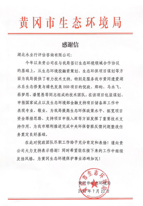 7月22日,黃岡市生態環境局致函永業行,對我司在生態環境投融資策劃、生態環保項目謀劃工作給予肯定和感謝。