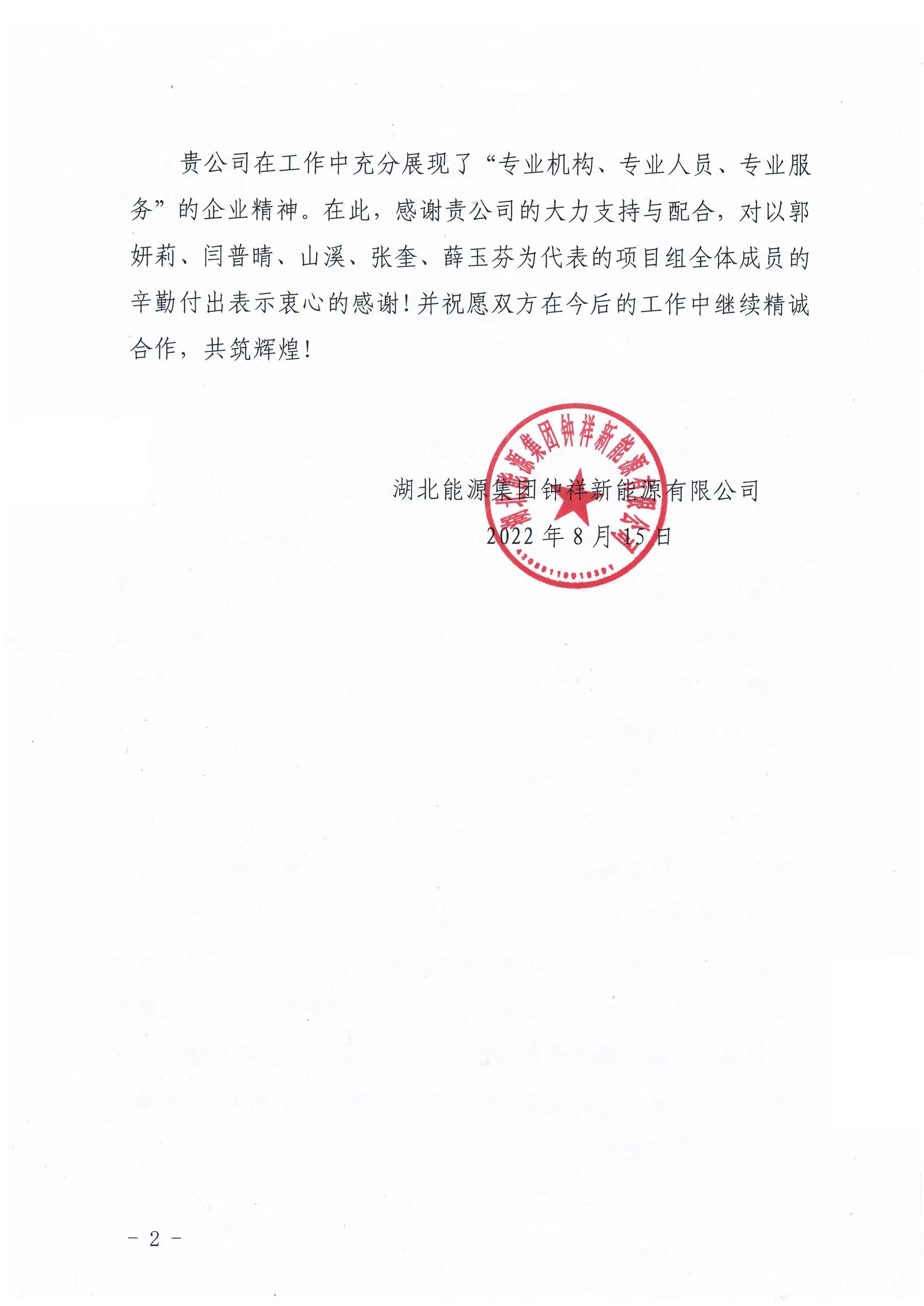 2022年8月16日,湖北能源集團鐘祥新能源有限公司致函永業(yè)行,對我司承擔的鐘祥雙河100MW農(nóng)光互補電站項目地災、壓礦、用地預審、規(guī)劃選址專題工作給予肯定和感謝。