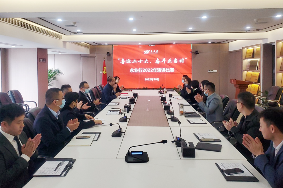 2022年10月10日,永業(yè)行“喜迎二十大,奮斗正當(dāng)時(shí)”演講比賽在總部會(huì)議室隆重舉行。經(jīng)過(guò)預(yù)賽選拔,9名來(lái)自總、分部的參賽選手同臺(tái)競(jìng)技。永業(yè)行黨委書記、董事長(zhǎng)潘世炳,常務(wù)副總裁吳學(xué)鋒,副總裁程為民,總部各職能部門負(fù)責(zé)人、分部?jī)?yōu)秀員工代表通過(guò)線上線下形式出席并擔(dān)任評(píng)委。本次演講比賽還特別邀請(qǐng)了黨建指導(dǎo)員郭群到達(dá)現(xiàn)場(chǎng)觀摩并指導(dǎo)工作。
