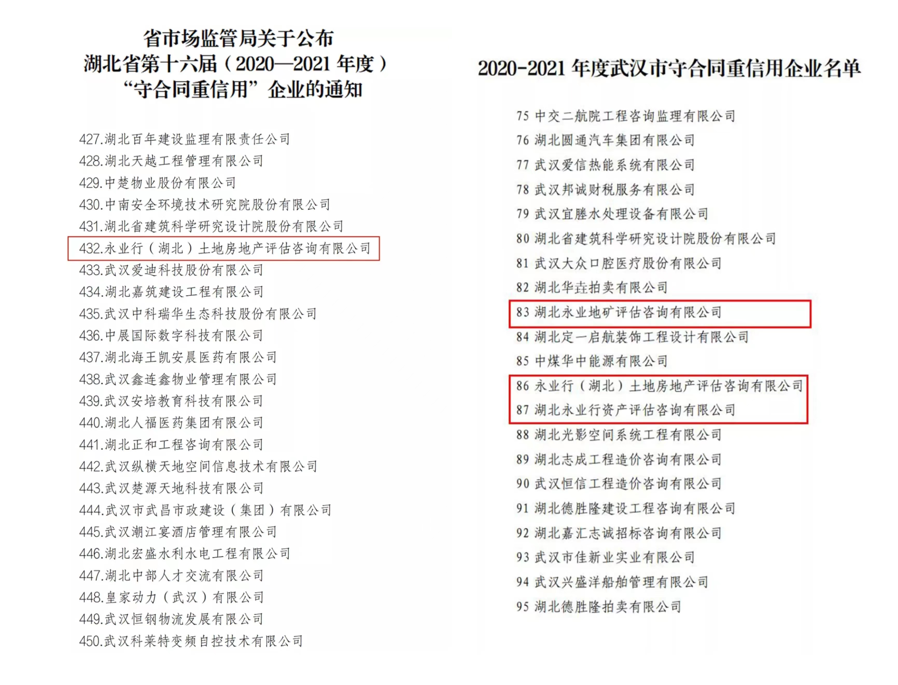 近日,湖北省市場監督管理局、武漢市市場監管局公布了2020-2021年度“守合同重信用”企業名單。永業行多家公司榜上有名,連續十二年獲評省市兩級“守合同重信用企業”。