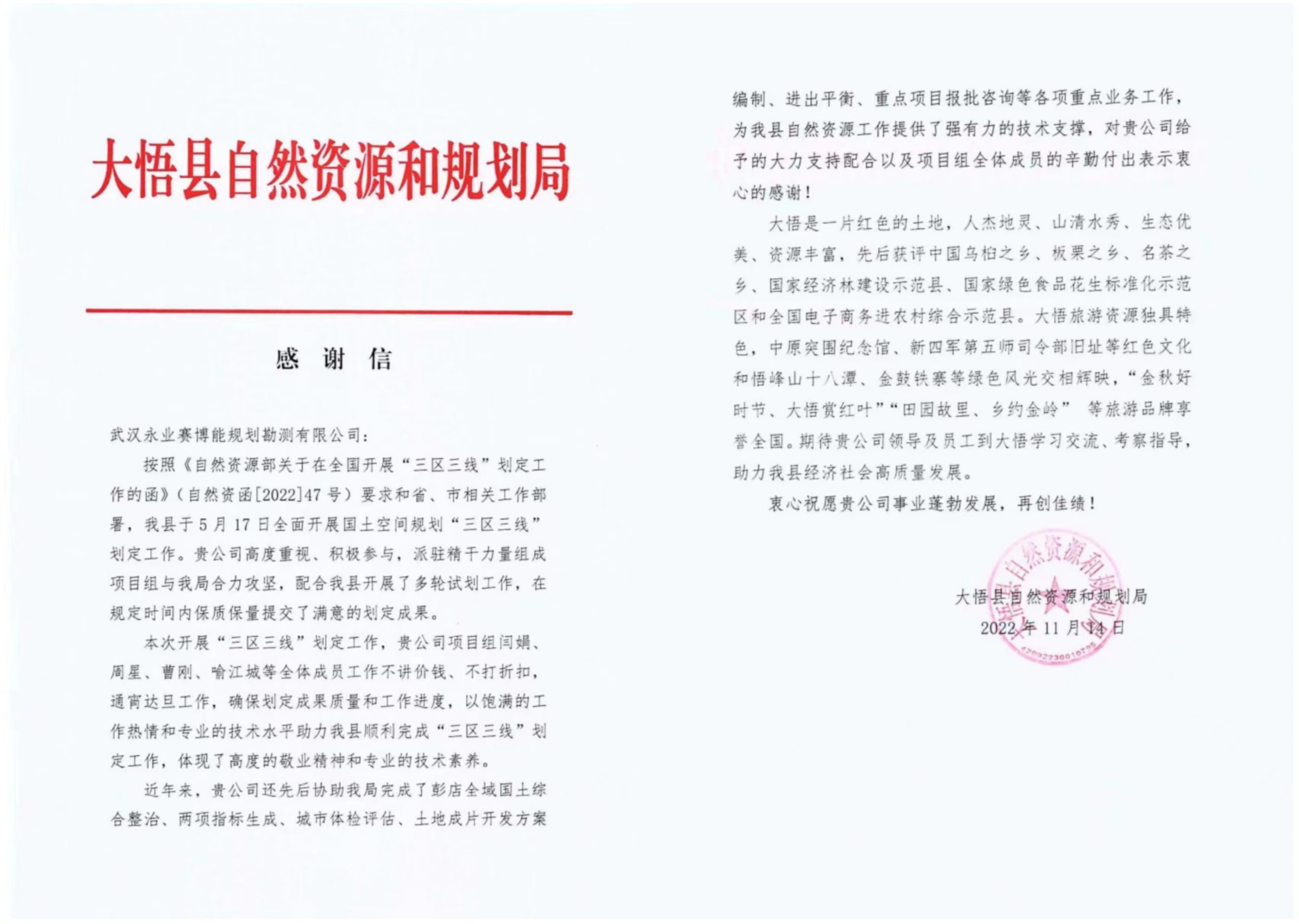 信中對我公司承擔的大悟縣國土空間規劃“三區三線”劃定工作表示高度肯定和衷心感謝,感謝信稱我司“三區三線”項目組工作不講價錢、不打折扣,通宵達旦工作,體現了高度的敬業精神和專業的技術素養。