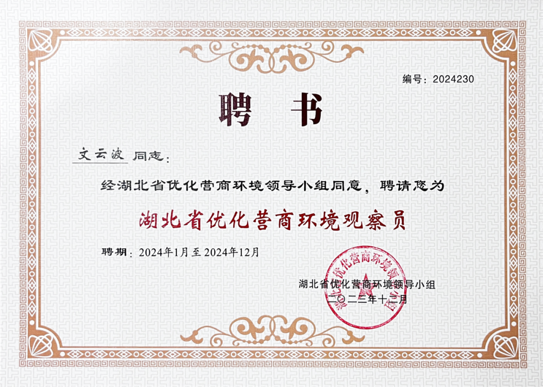 2023年12月15日下午,2024年度湖北省營商環境觀察員和監測點負責人培訓會在武漢舉行。經湖北省優化營商環境領導小組公開選聘、省政府批準同意,永業行獲授牌“湖北省優化營商環境監測點”,永業行高級副總裁文云波受聘為“湖北省優化營商環境觀察員”。