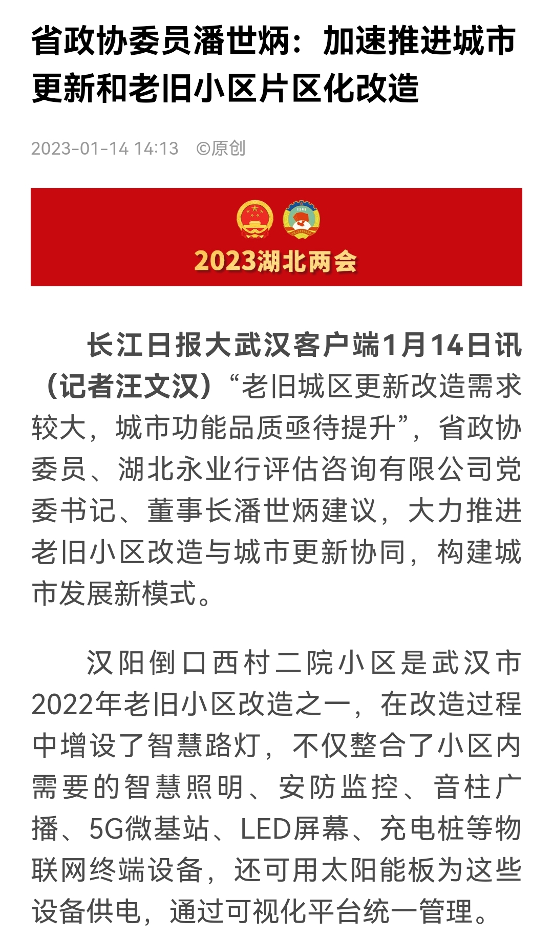 2023年1月,潘世炳向湖北省政協十三屆一次會議提交了《老舊小區連片改造 推進城市更新升級》提案,獲湖北日報、湖北衛視、湖北經視、長江日報、長江云等多家媒體報道,并作為省政協重點提案獲湖北省副省長張文彤領辦。提案中指出,我省城建發展還存在一些不足,比如城市功能品質亟待提升、市政基礎設施老化破損的改造需求較大、老舊城區更新改造需求較大、對市場化資金撬動力度需加強。提案建議從加速推進城市更新和老舊小區片區化改造、引導多主體協同推進、打通項目多元化資金籌措渠道等方面著手,大力推進老舊小區改造與城市更新協同,構建城市發展新模式。