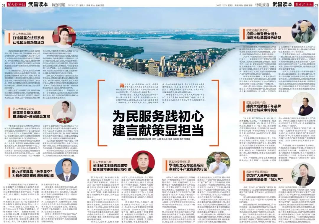 會上,來自武昌區各行各業、各條戰線的人大代表匯聚一堂,為武昌區高質量發展建言獻策。作為武昌區人大常委會預算工委副主任,文云波密切關注轄區資源優勢整合、優化營商環境,助力打造商貿中心。他提出要高效整合轄區資源,推動低碳+商貿融合發展,“要注重打造差異化消費結構,使用創新工具盤活存量商業體,將綠色低碳理念與商貿業融合,形成武昌特色。”