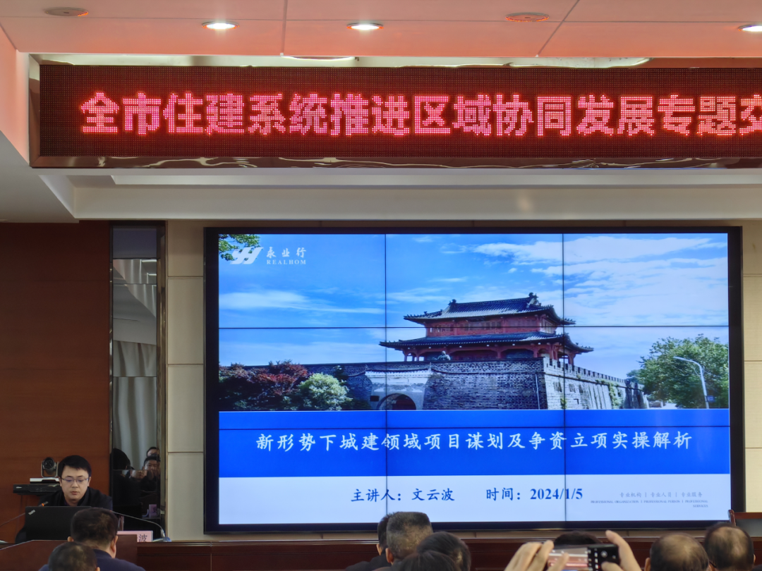2024年1月5日,襄陽市住房和城鄉建設局召開全市住建系統推進區域協同發展專題交流培訓會,永業行高級副總裁文云波受邀作新形勢下城建領域項目謀劃及爭資立項實務解析專題培訓交流,市住建局黨組成員、副局長張德平出席會議,市住建局黨組成員、副局長章成強主持會議。