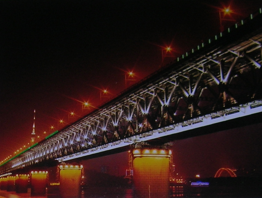 今年為慶祝建國60周年,武漢市政府重新用景觀燈裝飾了長江大橋等標志建筑?!秶鴳c夜色中的武漢長江大橋》這一作品是劉曉峰總經理于國慶節(jié)前夕、華燈初上時在大橋下拍攝的。燈火璀燦的長江大橋象征著我們祖國正走向繁榮昌盛的明天。