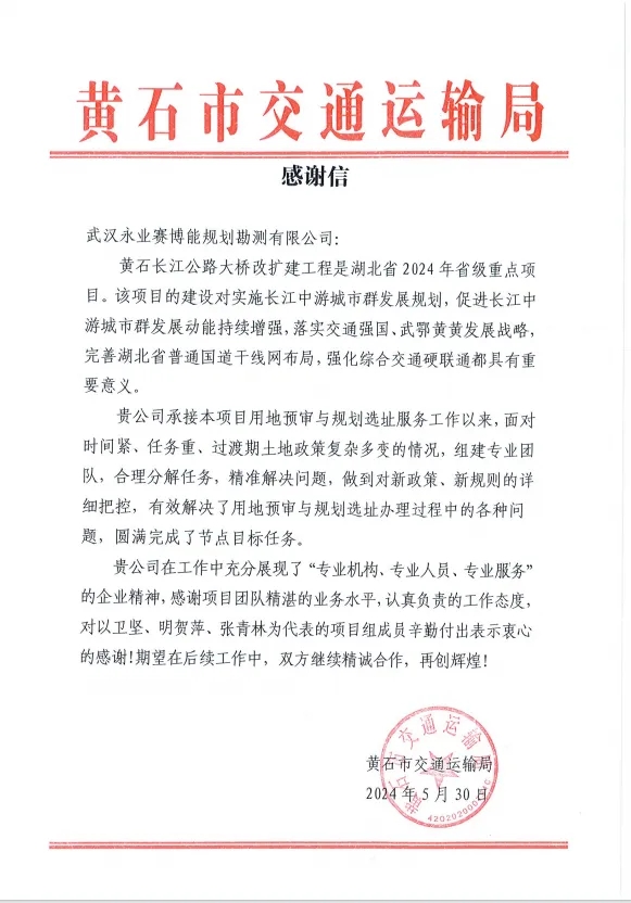2024年6月,永業行獲黃石市交通運輸局感謝信,信中充分肯定我司“專業機構、專業人員、專業服務”的企業精神,表達持續精誠合作的美好意愿,并給予我司事業蓬勃發展,再創佳績的衷心祝福。