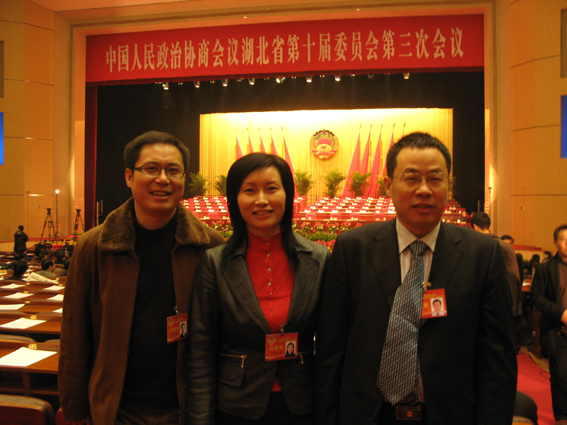 圖為總裁潘世炳與武漢市人民檢察院副檢察長周佳念(左)、武漢理工大學博導陳曉芳(中)教授在政協會上合影