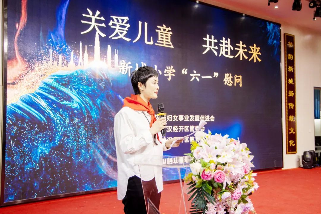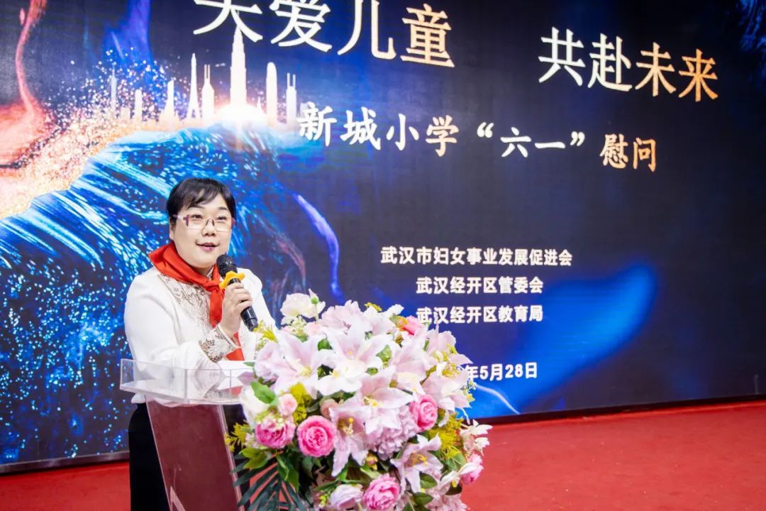 武漢經(jīng)開區(qū)教育局黨委書記、局長熊白莉上臺(tái)致辭。她指出,武漢市婦女事業(yè)發(fā)展促進(jìn)會(huì)與各位市老領(lǐng)導(dǎo)來到經(jīng)開區(qū)新城小學(xué)開展捐贈(zèng)慰問活動(dòng),充分展現(xiàn)了對(duì)經(jīng)開區(qū)教育工作的厚愛和對(duì)孩子們健康成長的期望。希望新城小學(xué)以此次活動(dòng)為新起點(diǎn),落實(shí)好立德樹人根本任務(wù),繼續(xù)秉承“快樂童年 多彩人生”的辦學(xué)理念,用好捐贈(zèng)的教育資源,將足球這一辦學(xué)特色發(fā)揚(yáng)光大,用優(yōu)秀的辦學(xué)成果回饋各級(jí)領(lǐng)導(dǎo)和社會(huì)各界的關(guān)心支持。
