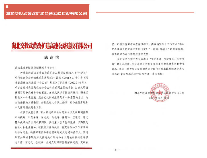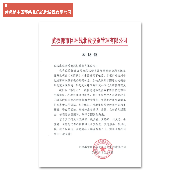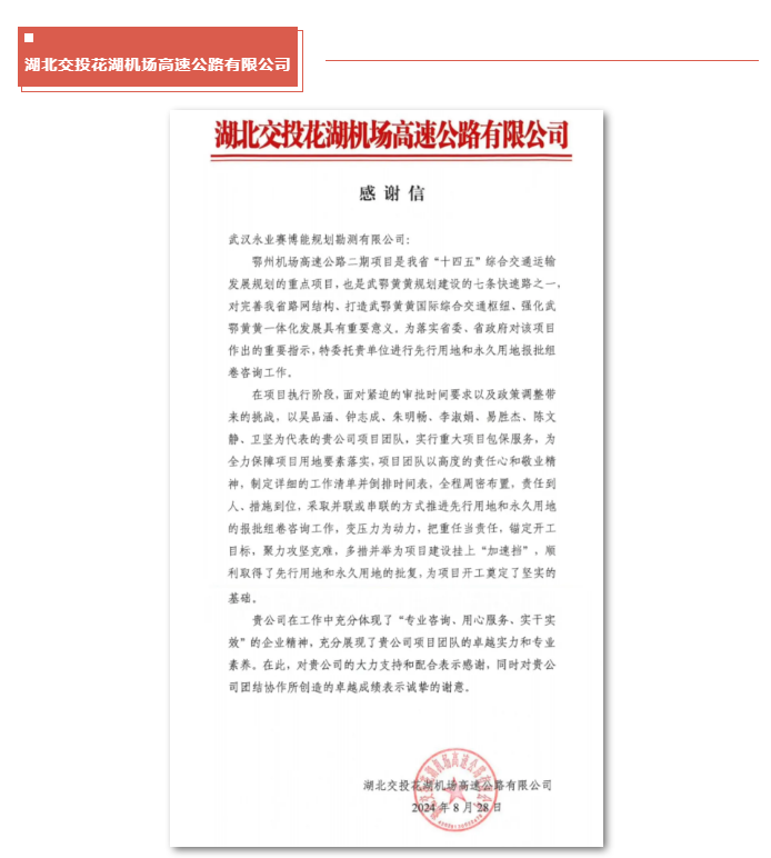 近期,永業(yè)行陸續(xù)收到來自武漢都市區(qū)環(huán)線北段投資管理有限公司、湖北交投武黃改擴(kuò)建高速公路建設(shè)有限公司、湖北交投花湖機(jī)場(chǎng)高速公路有限公司發(fā)來的表揚(yáng)信和感謝信。