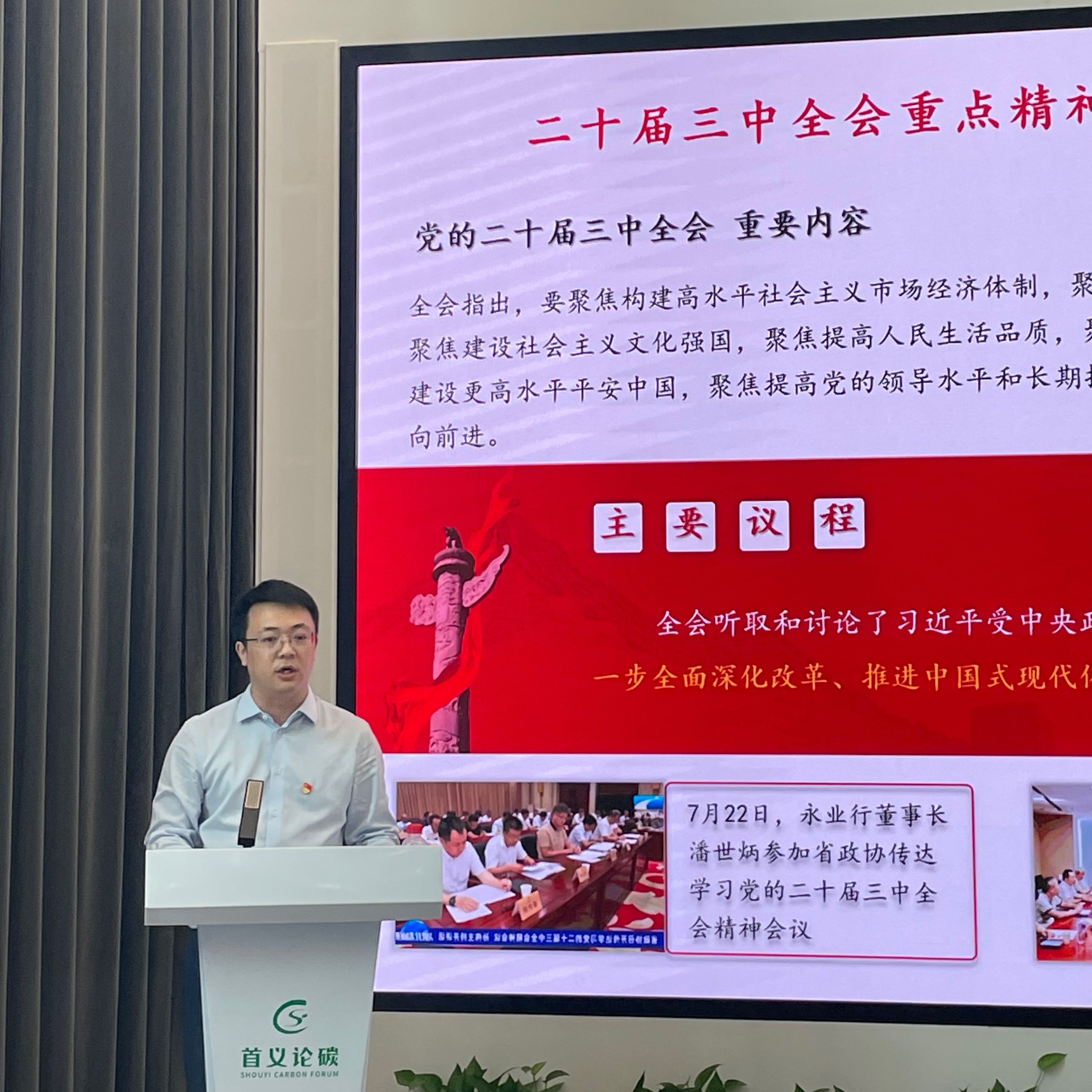 文云波結合永業行黨建工作實際,分享了永業行將思想和行動統一到全會精神上的改革創新經驗做法。他表示,永業行始終堅持黨建引領、參政議政、企業經營“三結合”,將黨建文件學習和公司戰略研討、業務優化、咨政建言相結合,極大提升了參政議政的針對性和專業服務的實效性。近年來,聚焦“資源-資產-資本”轉化路徑,圍繞大財政體系深化賦能,協同降碳、減污、擴綠、增長,推動環境、金融、產業、投資等要素與經濟活動的耦合協調,為區域發展提供智力支持和解決方案,全力賦能綠色轉型。2024年8月8日,湖北省委副書記、省長王忠林等領導調研永業行,對永業行在綠色低碳發展、“資源—資產—資本”轉化路徑、大財政體系等方面的探索、創新實踐給予高度評價,并對永業行在綠色低碳發展、三資轉換等方面寄予厚望。結合永業行實踐案例,深入解讀了二十屆三中全會關于推動生態文明體制改革精神要義,為區域綠色發展轉型提供了相關思路建議。