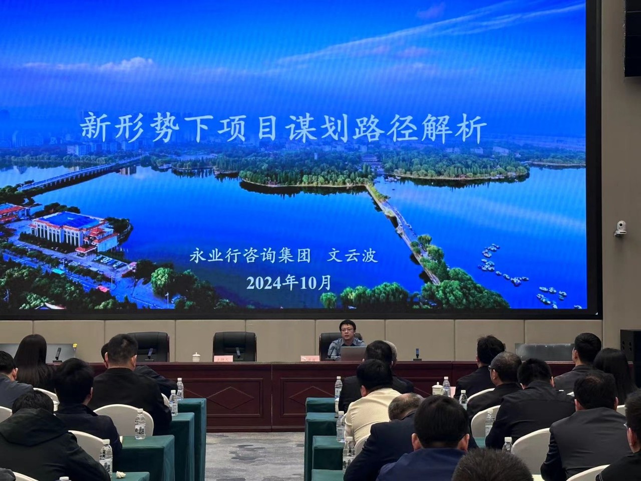2024年10月23日,黃石市國有資本投資集團有限公司舉辦“國投大講堂”開班式,市國投集團黨委書記、董事長秦金波出席會議,黨委副書記、副總經理蔡軍主持會議。永業行高級副總裁文云波受邀參加開班儀式并作《新形勢下項目謀劃路徑解析》專題培訓分享。