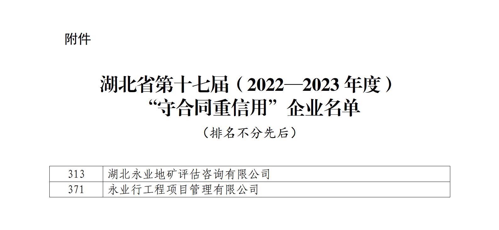 2024年10月21日,湖北省市場監督管理局公布了湖北省第十七屆 (2022—2023年度)“守合同重信用”企業名單。成員機構湖北永業地礦評估咨詢有限公司、永業行工程項目管理有限公司榜上有名,連續十三年獲評湖北省“守合同重信用企業”。