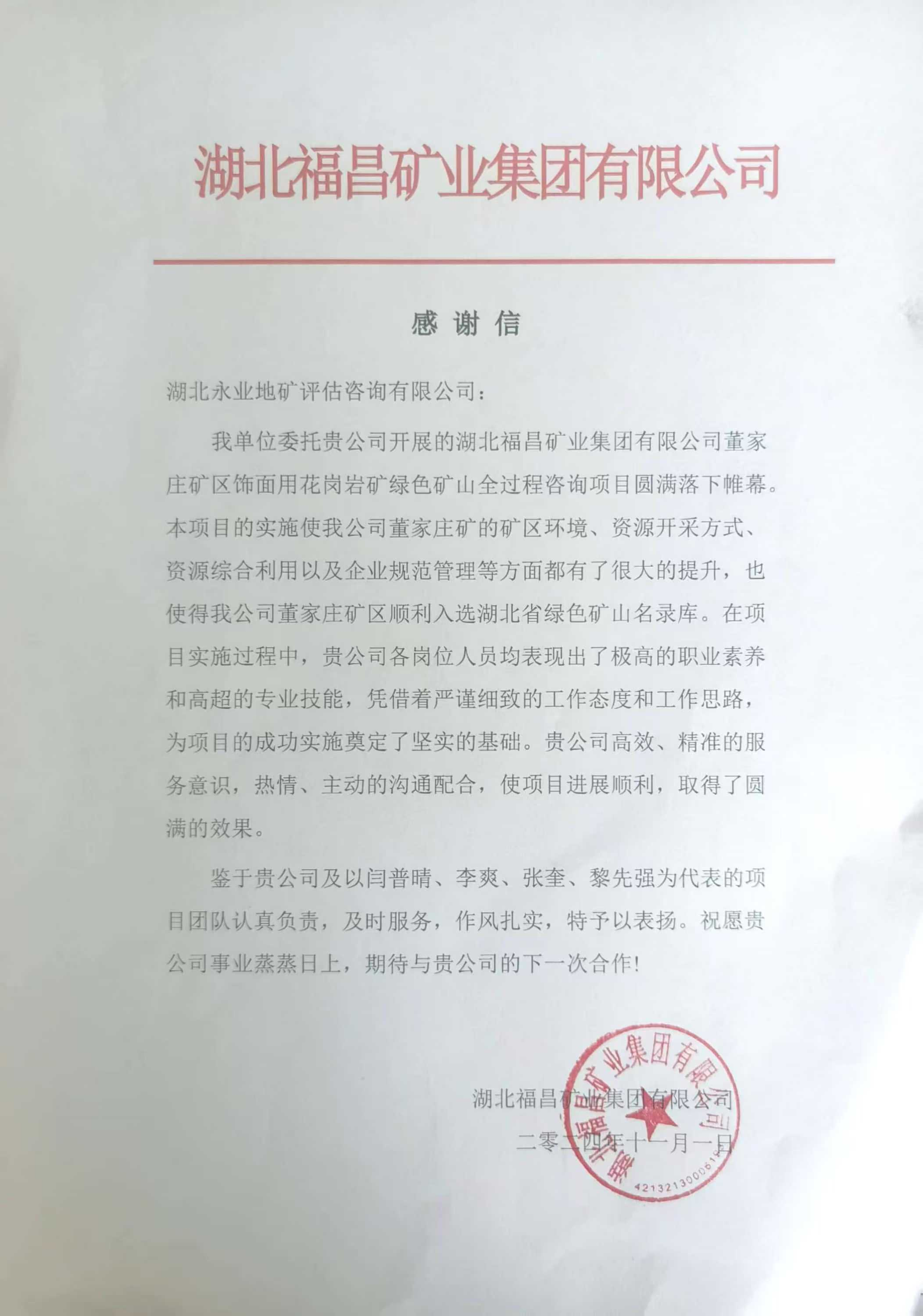 近日,永業行憑借卓越的專業服務和深厚的行業積淀,助力湖北福昌礦業集團有限公司(下稱“福昌礦業”)董家莊礦區入選湖北省“省級綠色礦山”。2024年11月1日,福昌礦業致函永業行,對我司承擔的綠色礦山全過程咨詢服務給予肯定和感謝。