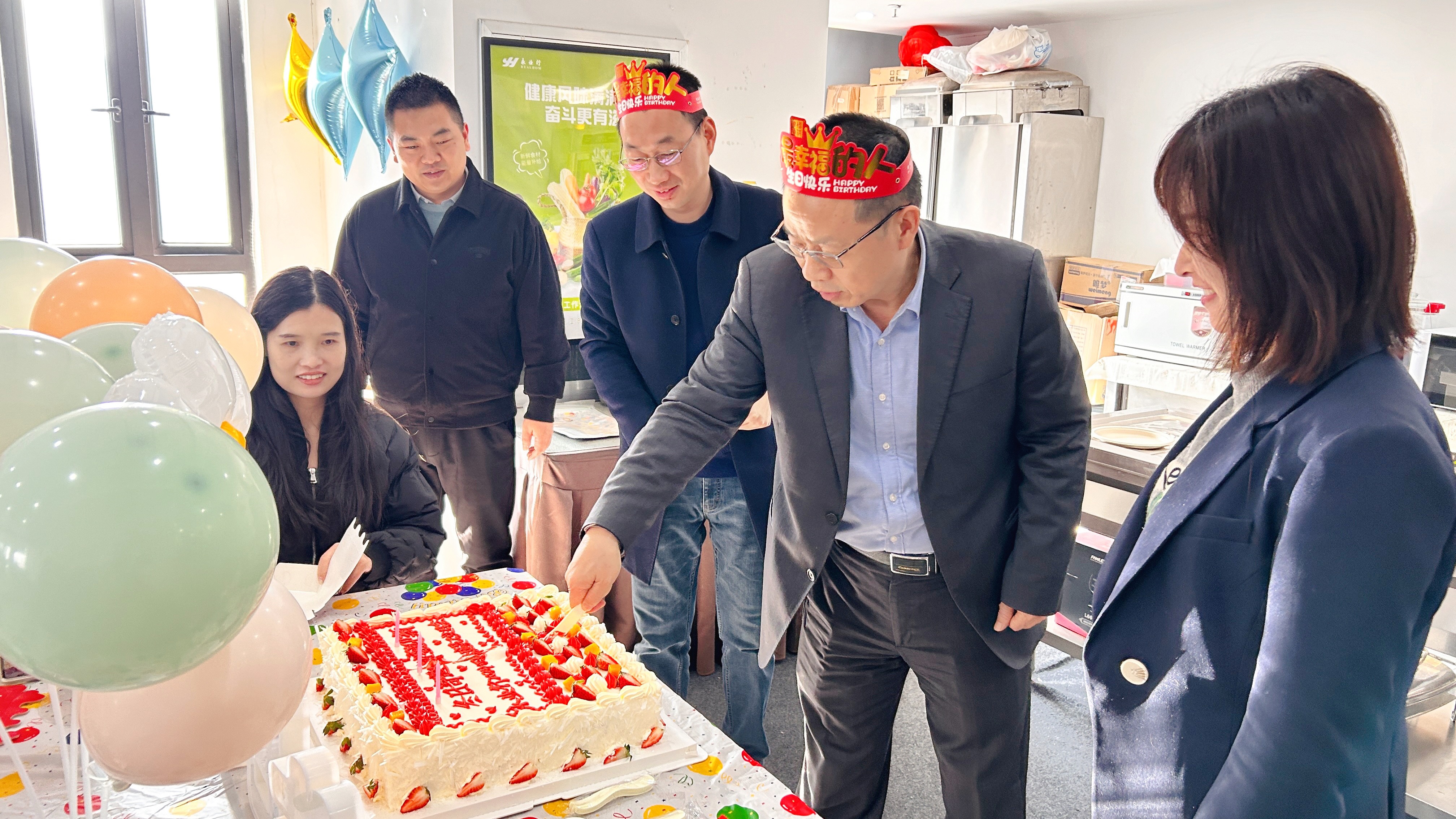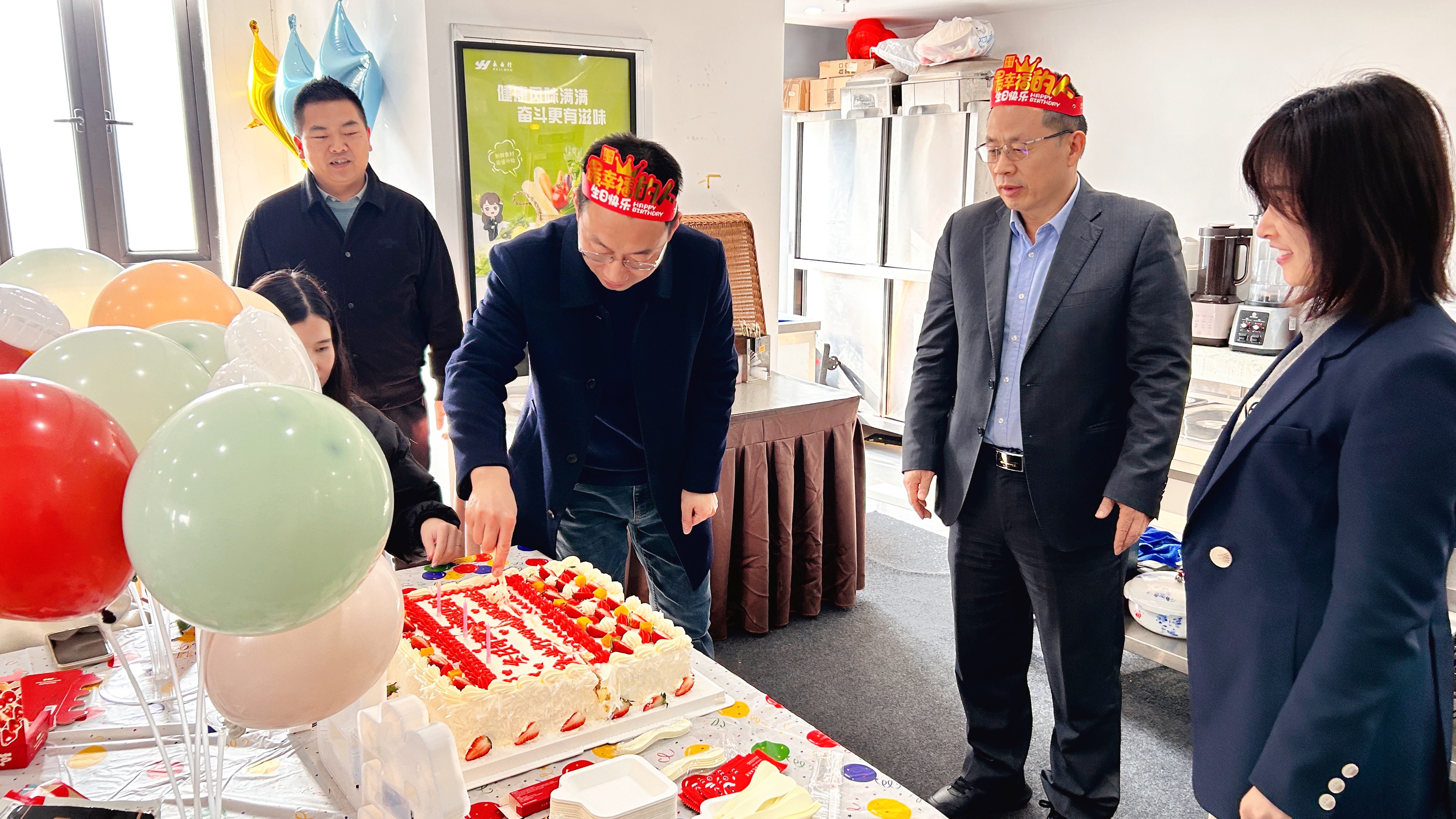 永業(yè)行董事長潘世炳、副總裁金建華到場祝賀,潘世炳向所有員工道一聲感謝、向四季度生日的壽星們送一份祝福,與壽星代表一起分享蛋糕,祝全體員工及家人新的一年有期、有盼、無憂、無慮,心懷熱愛,勇往直前,所愿皆圓。