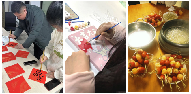 祥龍辭歲福澤滿,金蛇迎春瑞氣盈。大家坐在一起分享生日蛋糕,畫著飽含新年祝福的數字油畫,玩“狼人殺”“不要做”挑戰等小游戲;大家親手熬糖、掛糖,制作了一串串晶瑩剔透、紅亮誘人的水果冰糖葫蘆,瞬間勾起心底最溫暖的兒時回憶。活動現場節日氛圍濃厚,甜蜜與歡樂同行,咸寧分部全體員工感受到了“大家庭”的溫暖。