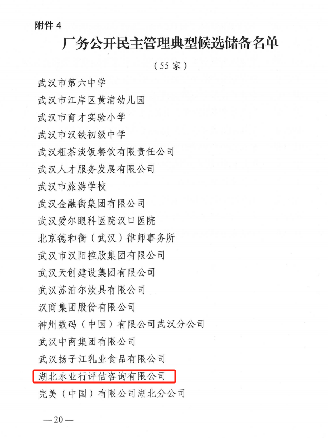 近日,武漢市總工會(huì)發(fā)布了關(guān)于2022-2024年度全市基層工會(huì)工作自查暨2024年全市企事業(yè)單位民主管理自查情況的通報(bào),對湖北永業(yè)行評估咨詢有限公司等55家廠務(wù)公開民主管理典型單位予以通報(bào)表揚(yáng),并列入下一步向全總、省總推薦的廠務(wù)公開民主管理典型的候選單位。
