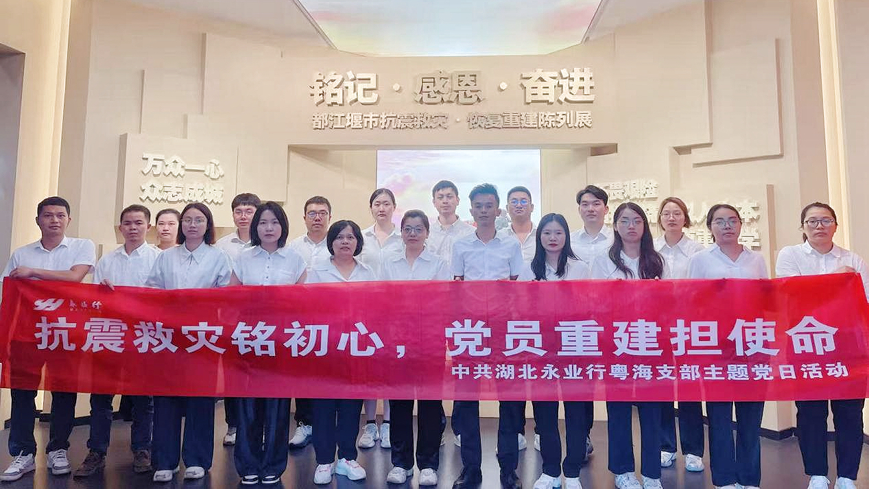 2025年6月22日,中共湖北永業行粵海支部委員會書記周攀帶領支部全體黨員、入黨積極分子及員工赴都江堰市抗震救災和恢復重建陳列館,開展“抗震救災銘初心 黨員重建擔使命”主題黨日活動,感悟“萬眾一心、眾志成城,不畏艱險、百折不撓,以人為本、尊重科學”的抗震救災精神,強化黨員責任擔當。