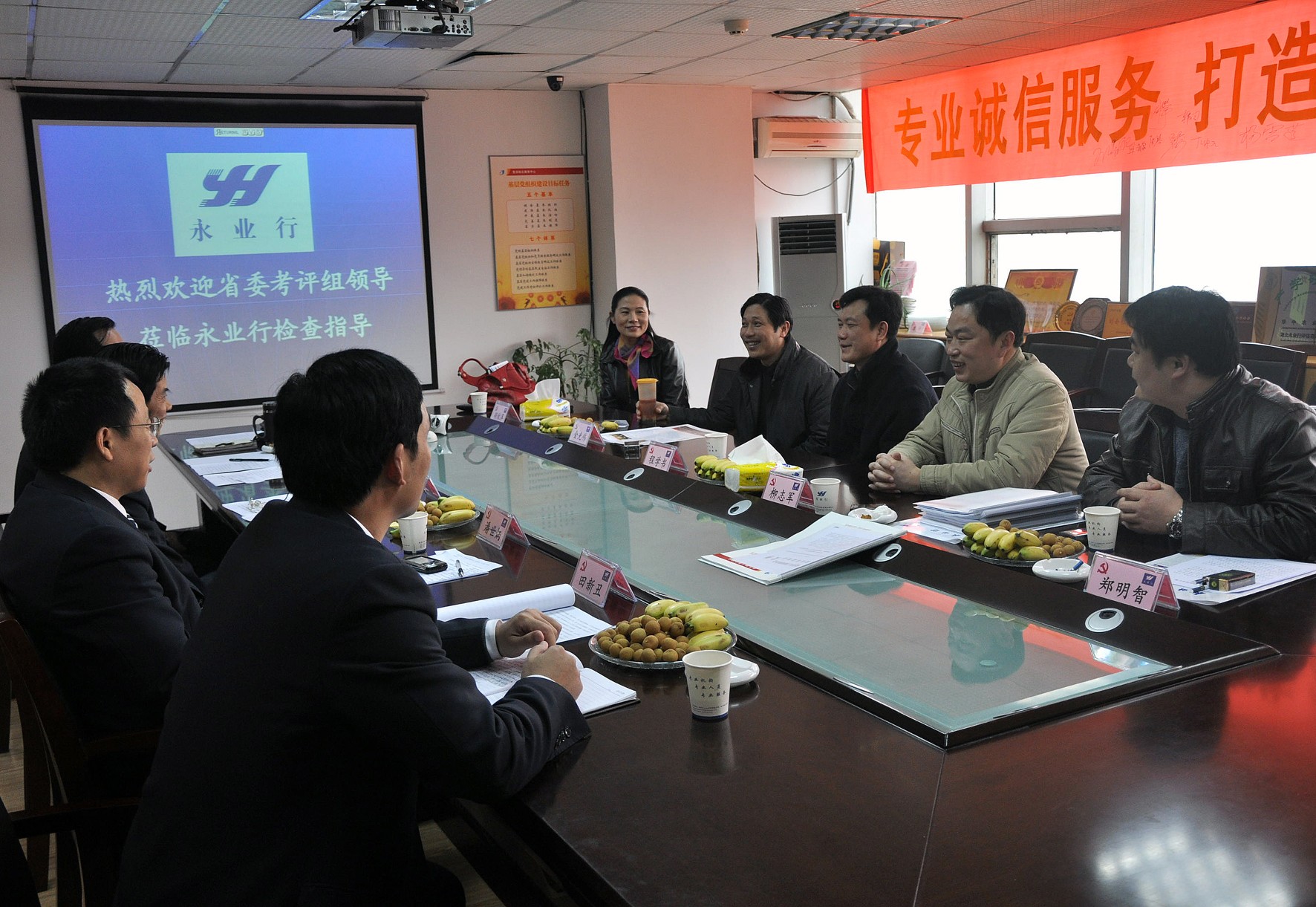 永業(yè)行黨委書記、董事長方國成,黨委副書記、總裁潘世炳,黨委副書記、副總裁靳劍輝,黨委委員、助理總裁田新丑熱情接待了省委考評組領(lǐng)導(dǎo)。考評組觀看永業(yè)行宣傳片后,方董向考評組領(lǐng)導(dǎo)詳細(xì)介紹了公司的基本情況,匯報(bào)了永業(yè)行黨建工作;潘總對考評組領(lǐng)導(dǎo)的提問逐一作了解答和說明,并就企業(yè)黨建和組織發(fā)展等問題向考評組提出了建議。考評組聽取工作匯報(bào)并認(rèn)真檢查永業(yè)行黨建工作有關(guān)資料后,對永業(yè)行黨建工作、創(chuàng)先爭優(yōu)活動(dòng)的開展予以了充分肯定。