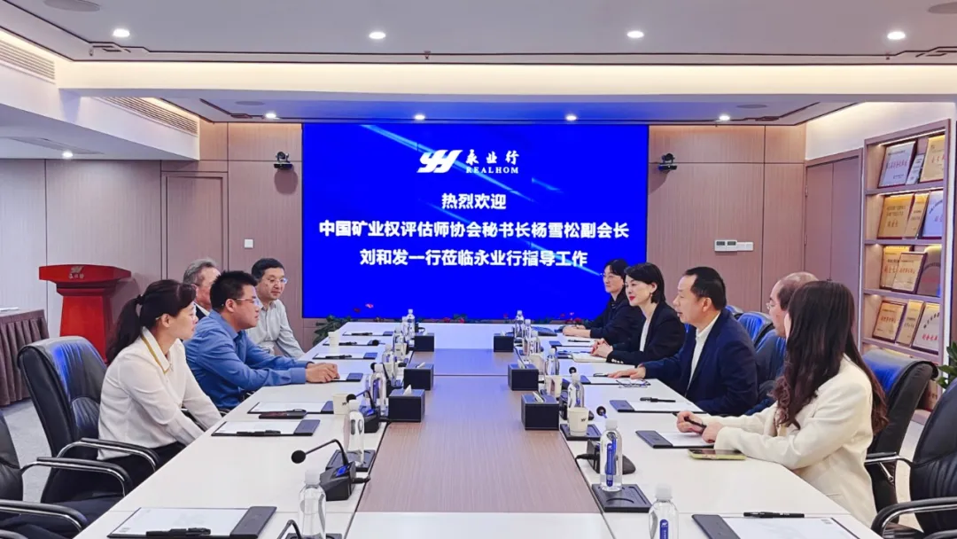 2025年4月22日,中國礦業權評估師協會秘書長楊雪松一行蒞臨永業行調研指導工作。中國礦業權評估師協會副會長劉和發、礦業權評估專業委員會委員柳海華、中國地質大學(武漢)經濟管理學院教授王來峰等參加調研。永業行董事長潘世炳、常務副總裁吳學鋒、聯席總裁王琴熱情接待并參與座談交流。