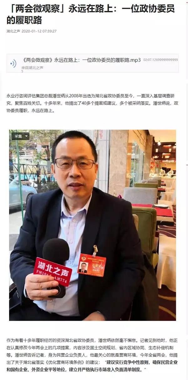 2020年1月11日至15日,政協湖北省十二屆三次會議在武漢召開。省政協委員、省房協會長、永業行董事長兼總裁潘世炳參加會議,并向大會提交了《關于推進湖北省實施生態補償的建議》《關于推進國土空間規劃的幾個建議》《關于湖北省落實<優化營商環境條例>的幾點建議》《深化區域協同 推動鄂黃黃臨空協同發展軸建設的幾點建議》等多份提案,人民網、《中國經營報》、《湖北日報》、湖北廣電、湖北之聲、長江云等多家媒體從多個角度對潘世炳委員的提案進行了深度挖掘和報道。