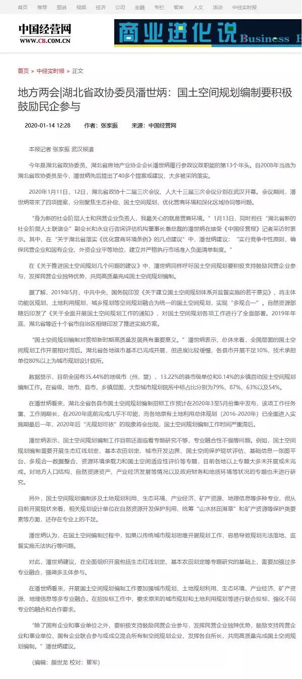 湖北省政協委員潘世炳:國土空間規劃編制要積極鼓勵民企參與
