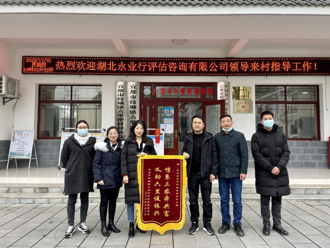 (宜昌市駐六里沖村工作隊(duì)第一書(shū)記、隊(duì)長(zhǎng)徐兵,六里沖村黨總支部書(shū)記、村委會(huì)主任黃華耘等向永業(yè)行贈(zèng)送錦旗,永業(yè)行投資咨詢事業(yè)群西南區(qū)域負(fù)責(zé)人兼全過(guò)程咨詢事業(yè)部總經(jīng)理?xiàng)铠P、西南區(qū)域副總監(jiān)高海曼等接受頒贈(zèng))