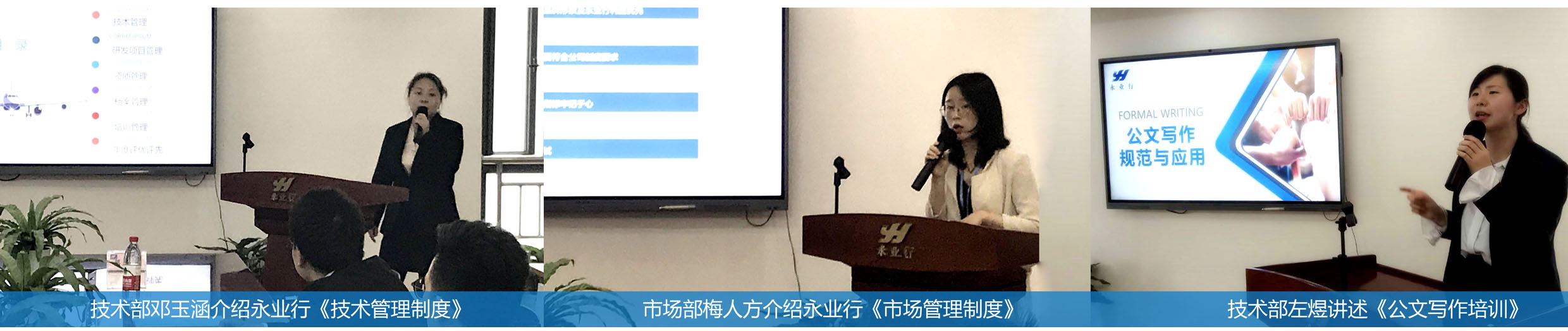 公司職能部門分別就《技術管理制度》《市場管理制度》《公文寫作》向新員工進行培訓。