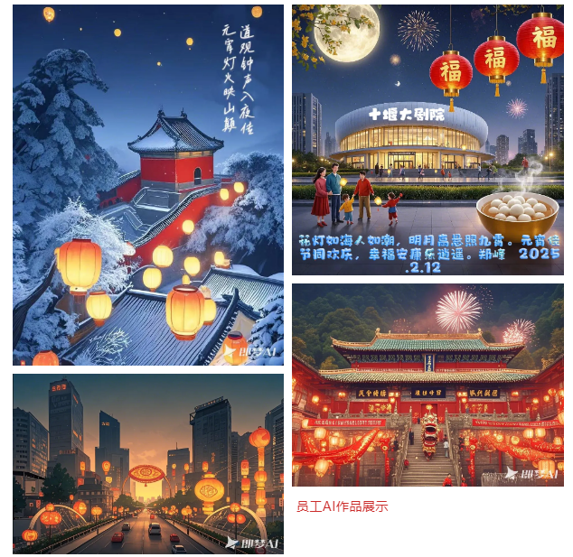 十堰分部在辦公室舉辦“元宵共慶,歡樂(lè)團(tuán)圓”主題活動(dòng),以手工制作和AI工具展開(kāi),通過(guò)親手制作兔子燈和金魚(yú)燈,增強(qiáng)了員工的動(dòng)手能力和團(tuán)隊(duì)協(xié)作能力。同時(shí),為跟進(jìn)人工智能技術(shù)的快速發(fā)展,鼓勵(lì)員工熟悉和快速適應(yīng)AI工具,十堰分部還組織員工結(jié)合十堰市地標(biāo)建筑用AI工具制作元宵節(jié)祝福畫(huà)作,青年員工們大顯身手,制作出各種精美的節(jié)日畫(huà)作,豐富了員工的業(yè)余生活,提高了員工工作積極性和創(chuàng)造力,營(yíng)造了和諧的工作氛圍,讓每位員工都能感受到節(jié)日的歡樂(lè)和團(tuán)圓的氛圍。
