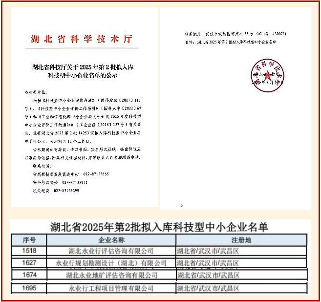 近日,湖北省科技廳公布了2025年第2批科技型中小企業(yè)入庫(kù)名單,永業(yè)行旗下4家公司入選,包括湖北永業(yè)行評(píng)估咨詢有限公司、永業(yè)行規(guī)劃勘測(cè)設(shè)計(jì)(湖北)有限公司、湖北永業(yè)地礦評(píng)估咨詢有限公司、永業(yè)行工程項(xiàng)目管理有限公司,4家公司均連續(xù)三年獲此稱號(hào)。